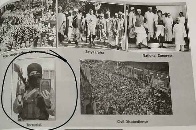 The picture, which has been named 'terrorist,' shows a man holding a rocket launcher in his right hand and the Quran in his left hand. It was published in the chapter titled ‘National movement - the last phase 1919-1947,’ under the theme of political systems and governance. The “terrorist” age is among other "important photos" depicting crucial events in the Indian freedom movement - the Non-cooperation movement, Civil Disobedience and Satyagraha, and leaders of the early days of the National Congress.