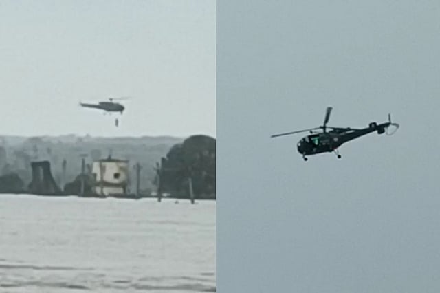 Two persons caught in flood waters in Telangana's Mancherial district were rescued by a helicopter on Thursday, July 14. A team of the National Disaster Response Force (NDRF) rescued the two farmers stuck in floods in the Godavari river in Oddu Somanpally village near Chennur in Mancherial. The farmers were stuck in swirling waters while searching for their cattle. As the water level continued to rise, they climbed on top of a water tanker. The locals had informed Chennur MLA and Government Whip Balka Suman, who alerted the authorities in Hyderabad and requested them to send a helicopter. The MLA and senior officials were present near the scene during the rescue operation. Both the farmers were airlifted and taken to National Thermal Power Corporation (NTPC) plant.