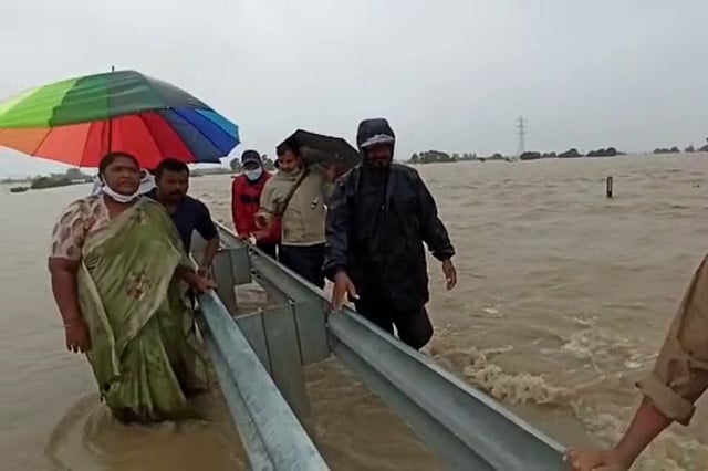According to reports, the two missing men, Allam Sivaji and Allam Kaviraju, belong to Bandarupalle village. They were on a bike when they lost their balance on the flooded highway and fell down, and have gone missing since then. The incident is reported to have occurred near the Medi vagu (stream) on NH 163.