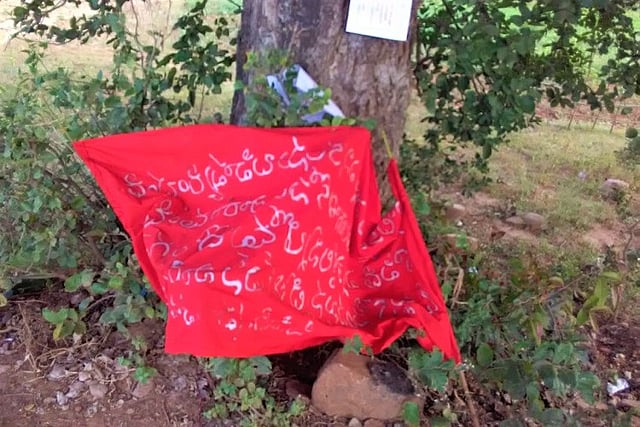 The banners and posters came up in the Upedu Veerapuram village in Venkatapuram mandal, around 5 km away from the Venkatapuram police station. Some banners were tied onto poles at the side of the road near a farm, and pamphlets were also found strewn around. One banner was spread out in the middle of the road, held down with stones, which blocked traffic during the early hours of Thursday.