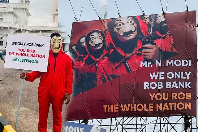On Friday, in the city's LB Nagar, a giant hoarding was erected mocking PM Modi with a parody of Money Heist , a popular Netflix series. The hoarding has a photo of a money heist gang with a message that read "Mr N Modi we only rob banks, you rob the whole nation."