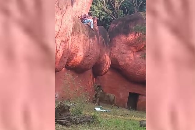 A man in Hyderabad entered the enclosure where lions are housed at the Nehru Zoological Park in the city on Tuesday, November 23. The 31-year-old, identified as G Sai Kumar, came almost face to face with a lion but was rescued. A video of the incident, shot by other visitors, shows the man sitting on a boulder as a lion on the ground looks up at him. At one point, the lion is even seen charging at the boulder and trying to jump. However, staff members of the zoo soon reach the rocks and escort the man out.