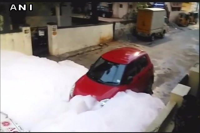 According to local reports, the froth came through a manhole along with rainwater and got accumulated on the roads.