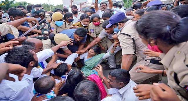 As she started walking to the station, the police detained Sharmila. Mild tension ensued as the party cadres and youth confronted the police while they were taking Sharmila into custody. Women police personnel were seen forcibly lifting Sharmila and taking her into a police vehicle.