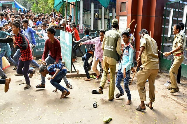 Young boys can be seen fleeing from the khaki-clad men charging at them with sticks, some even fallen to the ground, as a crowd of many students look on from beyond a barricade. The fear is writ large on the faces of the boys’ as they try to escape.