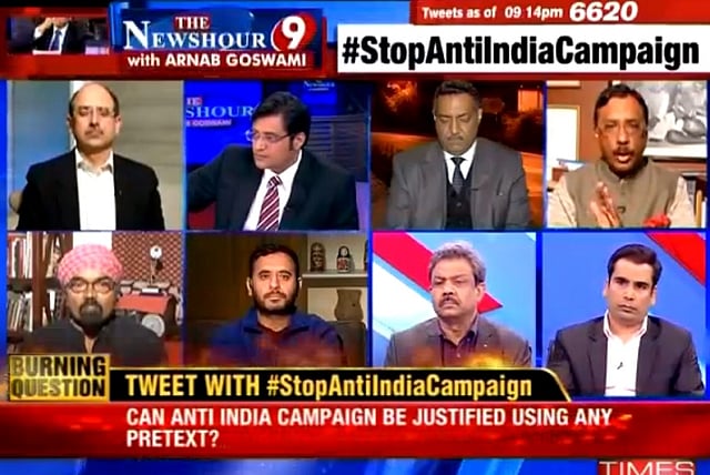 He uses coercion and intimidation through the means of right wing members on his panel. On Monday night, the only time He was quiet on the show was when Sambit Patra of the BJP shouted at Shabnam Lone, Saba Naqvi, and Waris Pathan and challenged the three to chant Bharat Mata Ki Jai after him. This is extremely dangerous intimidation. And he does this on absolutely every show.
