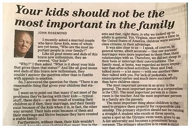 The article was published on January 1 in the Naples Daily News and has gone viral after it was posted on Facebook by a social media user. The crux of the article is this: children should not be considered the most important people in the family because they are dependent on their parents for their survival and parents should reclaim their status as boss of the family.