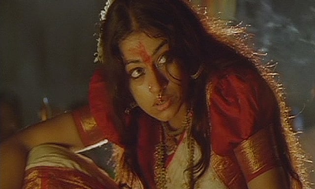 One of the characters in the film assumes her to be a ghost as soon as she steps out of a Maruti car, her silhouette bathed in the red glow of its light. In another scene, a character sees her eyes through an ornate wooden lattice and is terrified. Her husband is warned by the head of the family that girls from other families (Ganga is the outsider) will not be treated kindly in Madampally by the ghost (and even, perhaps, the family?). Later in the film, she is possessed by the ghost of a dancer called Nagavalli.