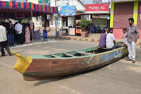 In Mandadam, where the road to the Secretariat was blocked by protesters, a boat was stationed in the middle of the road, with the words ‘Rajadhani Padava’ (Capital boat) written in the YSRCP party colours of green, white and blue. A few men sitting in the boat were seen derisively asking passersby to watch out for the floodwaters and join them on the boat instead. They were mocking the expert committee’s concern over constructions being built over certain parts of Amaravati like Thullur, which are feared to be flood prone.