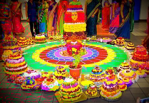 The festival is celebrated only in Telangana and for all the nine days of Dussehra. On the moonless night of the Mahalaya Amavasya, ladies gather to make meticulous flower arrangements on large plates made of wood or bamboo frames. The main flowers used are ‘Gunugu’, ‘Thangedu’, ‘Banthi’ or marigolds, ‘Chaamanthi’ or chrysanthemums, ‘Taamara’ or the lotus, ‘Gummadi’ or Pumpkin flowers, ‘Dosakaya Puvvu’, ‘Gaddi Puvvu’ and ‘Vaama Puvvu’. A women-centric festival, it has imbibed a sense of unity and cooperation over the ages.