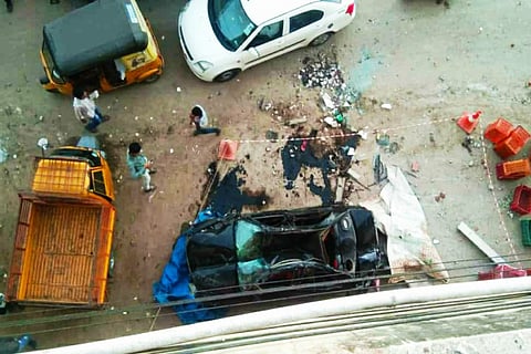 An overspeeding car falls off Bharatnagar flyover early Tuesday morning killing one and leaving five injured in Hyderabad @IndianExpress pic.twitter.com/WS13cr2jVF