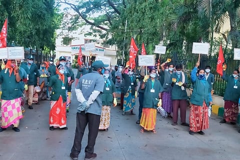 The protests come at a time when five pourakarmikas including a 28-year-old woman have succumbed to COVID-19, while at least 50 such workers have tested positive for the novel coronavirus.