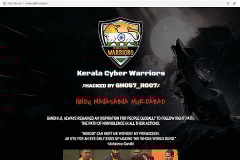A day after members of the Hindu outfit Akhil Bharatiya Hindu Mahasabha were caught on video carrying out a reenactment of Mahatma Gandhi’s assassination on his 71st death anniversary, the outfit’s website was hacked. The website, as of 3.45 pm on Thursday, displayed a black screen with the logo of Kerala Cyber Warriors and a message that stated that the website was hacked by a certain ‘GH057_R007.’