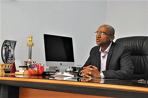 Senior IPS officer RS Praveen Kumar sitting at his desk in a black and white suit
