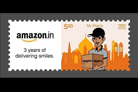 India Post on Friday marked the third anniversary of Amazon India's services in the country by releasing a Rs 5 stamp, which shows a delivery boy carrying an Amazon carton.