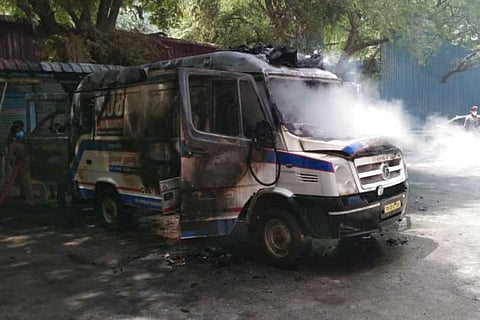 Moments after a COVID-19 patient reached Coimbatore Medical College and Hospital in an ambulance and walked down to the COVID ward, a reported leak in an oxygen cylinder and a short circuit reportedly set the ambulance ablaze in Coimbatore on Saturday. While the patient was already out, fortunately, the driver and the people nearby too escaped unhurt. The visuals from the incident showed a raging fire damaging at the rear and windshield of the ambulance. The fire and rescue personnel were seen trying to put out the fire with water hoses. The fire was finally put out after half an hour’s worth of effort.