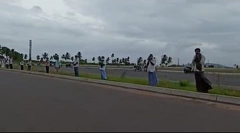 On Tuesday, a large number of farmers, including women, stood with folded hands on either side of the Seed Access Road, which is the road that connects Vijayawada to Amaravati, when the judges were passing through the area to the High Court. The move was part of a symbolic protest.