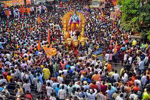 According to the organisers of Ram Navami Shobha Yatra in Hyderabad, when the procession was first held in 2010, only 10,000 people had participated. “Now, over a lakh people participate in it. This is a huge success,” says Bhagwanth Rao, President of Bhagyanagar Sri Ram Navami Utsav Samithi. Rao is also a senior leader of the RSS and the founding member of the Bhagyanagar Ganesh Utsav Samithi, which popularised the procession of the tallest Ganesh idol in Hyderabad.