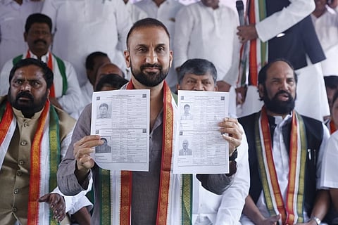 “This is what we are trying to tell the public and the ECI,” says Khan, who on Wednesday along with other TPCC leaders, staged a sit-in at Dharna Chowk where they showcased the fake Voter ID cards.
