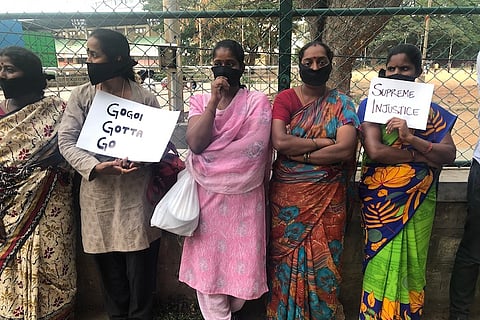 Next to a busy street in the heart of Bengaluru, around 30 women and a few men stood in silence, with black bands tied around their mouths. Most of them were holding placards and banners that read ‘Supreme Injustice’ and ‘Gogoi Gotta Go.’