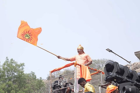 The main procession from Sitarambagh was led by Raja Singh and saw hundreds gather, sporting saffron caps and scarves. Huge speakers were set up to play high-decibel music and lyrics of the songs sung by Raja Singh had lines stating that the saffron flag would "soon be placed on every pillar in the country". The lyrics also said that "enemies of Hinduism would be made to cry tears of blood", before stating that "those who don’t chant Lord Ram’s name would be soon driven out of India".