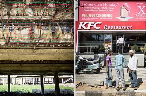 A warm egg, white shell almost translucent, plops into the wire mesh gutter and rolls forward. There is no let-up in the clucking din of the 16,000 other chickens in cages that stretch to the far end of the shed. They won’t survive more than a couple of years here, but their shit will be shovelled up for fertiliser and their eggs sold on for a few rupees each.