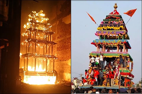 The 60-year-old wooden chariot of the Antarvedi temple was gutted in a mysterious fire in the wee hours of Sunday. The 40-feet high chariot made of teak wood was parked in a shed on the temple premises.The chariot was used during processions on special occasions and temple festivals.