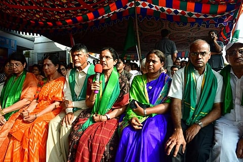 Bhuvaneswari, daughter of legendary actor, TDP founder and former Chief Minister N T Rama Rao, joined her husband in visiting Amaravati villages to meet protesting farmers and express solidarity with them.