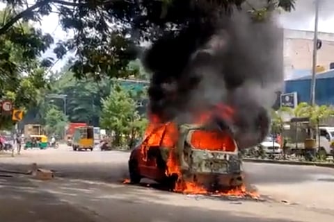 The protest by Congress workers in Bengaluru turned violent on Thursday, July 21, as party workers set fire to a car in Shanthinagar. A group of party workers belonging to the Youth Congress set the Hyundai car on fire in front of the ED office in Shanthinagar. The Congress was protesting against the questioning of party president Sonia Gandhi by ED in the National Herald case. Eleven persons have been detained in connection with the torching of the car. Another incident of torching a vehicle was reported from Sheshadripuram, but no arrests have been made yet.
