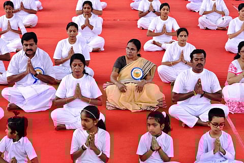 “Yoga is not part of any religion and it can be practised by one and all. Since our country is secular, we should ensure that Yoga too remains in the secular domain. Before one begins yoga, a believer can offer prayers to his or her own God, and for those who were non-believers, they have their own means to keep their mind focused on the same,” Shylaja said in her address to over 750 yoga participants who had gathered to take part in the function.