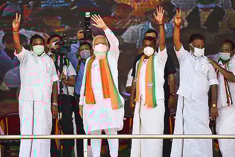 Modi said, “Friends, on one hand we have development as the agenda, on the other hand DMK has 'dynasty' as its agenda. They don’t have anything positive to offer. They hardly talk about their agenda and they only spread lies. They have not respected the mother of Tamil Nadu CM, god forbid if they come to power, they will insult all women.”