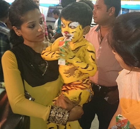 The News Minute | October 7, 2014 | 1.14 pm ISTPili Vesha (tiger costume) in Tulu or Huli vesha in Kannada is a tradition in the coastal districts of Karnataka in which boys and men paint themselves as tigers and dance through the streets to the beats of drums. As multiple groups of boys and men go from street to street, they are accompanied by the haunting beat of the drums that the sea breeze carries far away on a dark night.Generally, boys and young men pain themselves up in bright yellow paint with black stripes and well, colourful underwear. This year, after the festivities were over, the child and the man, could both be seen chilling out with their respective drinks.A child is seen drinking juice in Mangalore, a small city is Dakshina Kannada district.This man with his drink