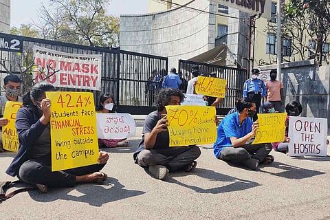 Nearly 25 students staged a sit-in protest outside English and Foreign Languages University (EFLU) campus in Hyderabad on Friday, demanding that the administration reopen hostels and library. The protesting students said that their academic career would be affected without access to the internet and library. The campus has remained closed indefinitely due to COVID-19 pandemic.
