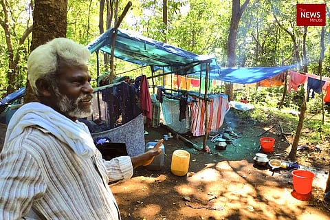 Twenty two-year-old Ratheesh’s eyes narrow in concentration as he scrapes the wooden handle of his handmade axe. He continues scraping until the skin of his palm smarts and peels off. “We left Nilakkal and relocated here (in Laha) around a month ago after the water in our well was contaminated,” he says as he picks up the foliage of peeled wood scattered on the ground.