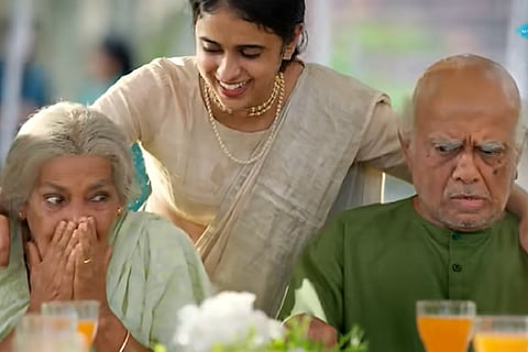 Itoop and Kochuthresiamma are introduced as a typical senior couple, minus the fights. The two care about the little details of each other, and embarrass their children with their expressions of love. A wedding in the family brings everyone home. A bunch of lovely actors trickle in — Ganga Meera, Radha Gomaty, Annu Antony, and two sets of actor twins all raw and refreshing. Attempts at humour begin in portraying the bride-to-be Elsie, played by Annu, as a young woman who wants to hastily get married and not live independently. Her brother Guinness is obsessed with winning a record for the family because of his name. Neither are bad ideas, just poorly scripted.