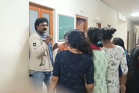 In many videos circulating via social media, Chinmayanand, the head teacher at a government school in Karnataka’s Mandya district can be seen sitting on the floor of the hostel corridor surrounded by a group of enraged girl students charging at him with sticks, and doing everything they can in a desperate attempt to oppose his alleged sexual misconduct. Thrown off by the wrath of the students, Chinmayanad appears intimidated to approach them. He is reluctant to come down the stairs where the students are seen to congregate. He seems to negotiate with them, asking them to calm down if they want him to answer their questions.