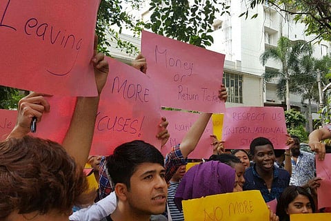 The Indian Council for Cultural Relations (ICCR) office in Bengaluru on Thursday witnessed sudden protests by around 50 international students who camped outside the office demanding payment of their rental allowance.