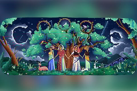 The Goodle, created by Svabhu Kohli and Viplov Singh, depicts four women -- among them purportedly Gaura Devi, Sudesha Devi, Bachni Devi -- protectively surrounding a huge tree in a forest in the dead of the night.