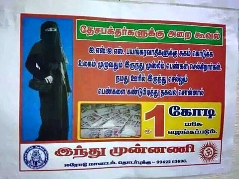 The News Minute | January 6, 2014 | 09:05 am ISTA poster which surfaced in Erode announced a cash award of Rs. 1 crore for any information on Muslim women who had been sent abroad to join the Islamic State(IS).The posters allegedly put up in the name of Hindu Munnai created a lot of unrest with political outfits demanding stern action against the perpetrators, reported The New Indian Express. However, the Hindu Munnani leaders denied any role in putting up the posters saying that it is the handiwork of anti-social elements. The Munnani State vice President K Pusappan whose mobile number was on the poster denied any involvement in the issue, said SP M R Sibi Chakravathy.Pusappan also said that since the poster carried his phone number, he had received threat calls, said the report. The district police has provided additional security to the Hindu Munnani leaders. The Cyber Crime Wing in Chennai will probe the incident, said the report. TweetFollow @thenewsminuteRead Godse statue for one, Afzal Guru memorial for the other: When will this obsession end?