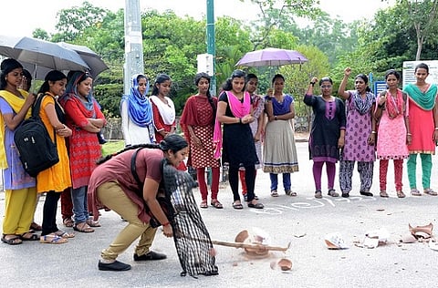 Highlighting the slogan, ”Freedom. Equality. Pride”, students of Kerala University also came out in protest on Tuesday. Krishna, a professor of Philosophy at Kerala University, inaugurated the march by breaking earthen pots. The group alleged that the legal system and successive women’s commissions had not done enough to guarantee women the rights they deserve.