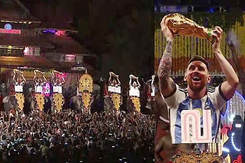 It’s been over four months since Lionel Messi and Argentina ended their 36-year long wait to lift the FIFA World Cup at the Lusail stadium in Qatar, but down south in Kerala, celebrations still seem to continue. It reached an all new level during the state’s iconic Thrissur Pooram festival on Sunday, April 30. In what came as a surprise to many witnessing the spectacle, large illuminated cut-outs of legendary footballer Messi holding the FIFA world cup were displayed atop 15 elephants lined up at the Thiruvambady side of the famous Sree Vadakkumnathan Temple.