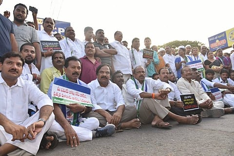 YSRCP cadres have also staged a dharna in front of Vijayawada bus stand.