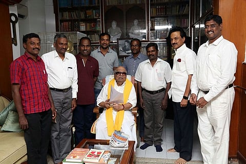 Folk artist Kovan who is currently out on bail in a sedition case met DMK supremo Karunanidhi and party treasurer M K Stalin at their residence In Chennai at 11 am on Thursday.