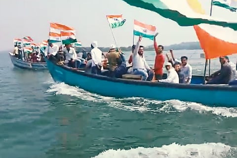 The protesters started from Ullal and traveled along the Netravati River to reach Adyar Kannur, and docked their boats 500 m away from the protest site.