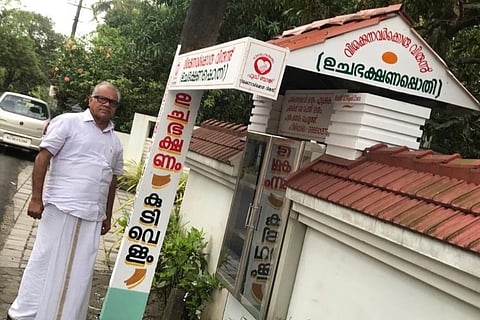 A counter with glass panes that can be opened, is seen near the compound wall of his house. A hoarding above the counter reads: ‘Food Bank, visakkunnavarkkoru virunnu (a feast for the hungry).’ A board on the side states, “Lunch and drinking water available.”