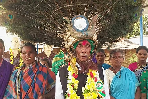 Speaking to TNM about how he is being treated post his felicitation, he says, “There’s a change now but only the coming days will tell what is in store.” Kanaka Raju, who is 80 years old, is from the Gond tribe. A native of Marlawai village in Jainoor mandal, Asifabad district, Raju has been teaching the Gusadi dance to men from his community for the past 40 years. He is the sole recipient of Padma Shri from Telangana in 2021.