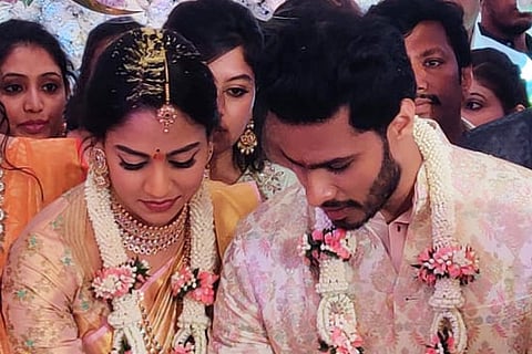 The couple wore matching clothes in gold and cream colours. Revathi wore a light peach and cream saree, while Nikhil wore a sherwani.