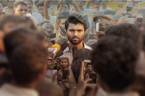 After Arjun Reddy, Vijay has been consciously cultivating his image as "rowdy", the man who flouts the rules and does things his way. Whether this construct is desirable for an audience that's already fed to the gills with glorified toxic masculinity is another question. In NOTA, he transforms to be "rowdy CM" as he hops from a booze party to the veshti-white shirt political party headed by his father, Vasudev (Nasser). Anand Shankar has been quick to capitalise on the very real political crisis in the state, the absurd theatre that plays out in the headlines day after day.