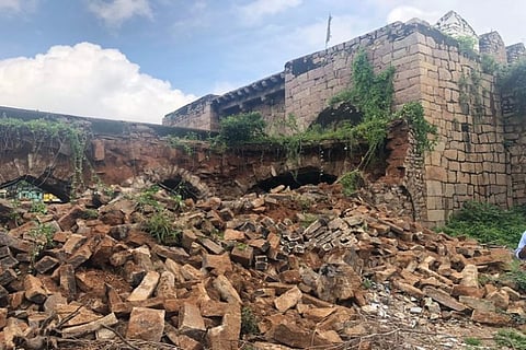A part of #MotiDarwaza, one of the entrances of #Golconda has collapsed due to heavy rains