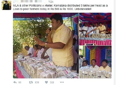 Another WhatsApp forward caption accompanying the picture had read, “In Bangarpet Kolar: today morning MLA and few politicians have give money to people in a meeting 3lakhs per head as a loan. Every 1 thought they are doing good work but actual fact is this these notes are no more valid and it has to be exchanged in bank by individuals by producing ID's, and they have to repay the loan with interest.. Pl circulate to all till it gets gov't attention [SIC].”